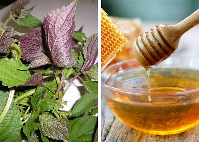 - Sau đó, dùng 3 thìa mật ong trộn đều với lá tía tô đã xay.